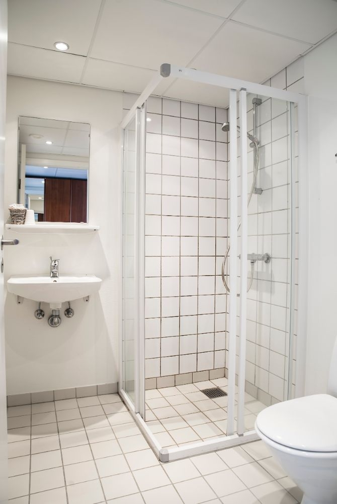 Dobbeltseng (2 enkeltsenge sat sammen), eget bad og toilet, skrivebord, lænestol, fladskærm,...